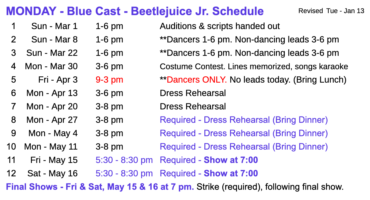 This show features excellent parts to challenge older, mature performers, and lots of opportunities for beginners to have a blast on stage. Performers are responsible for providing their own costume.