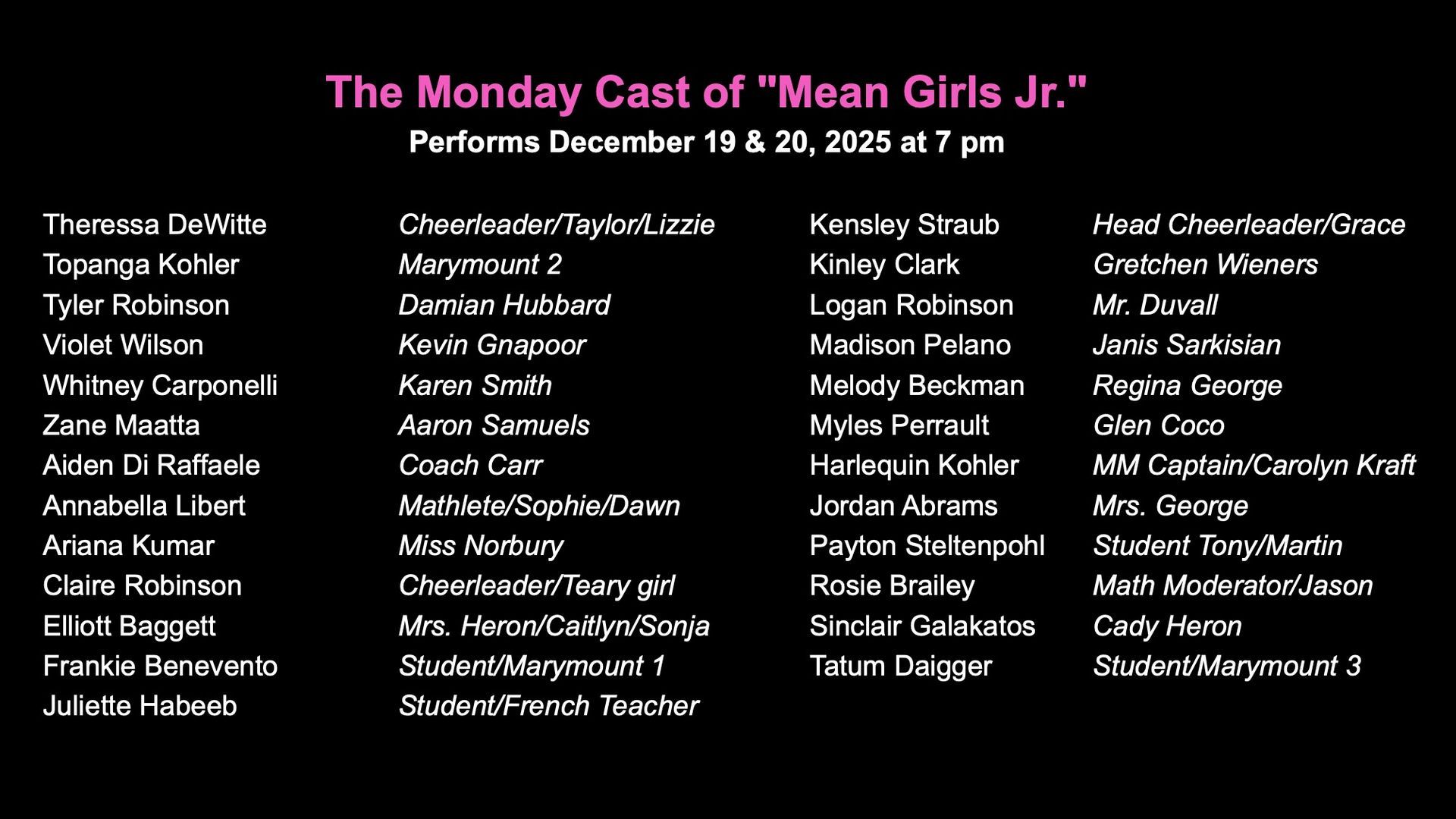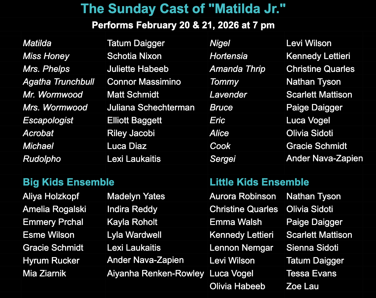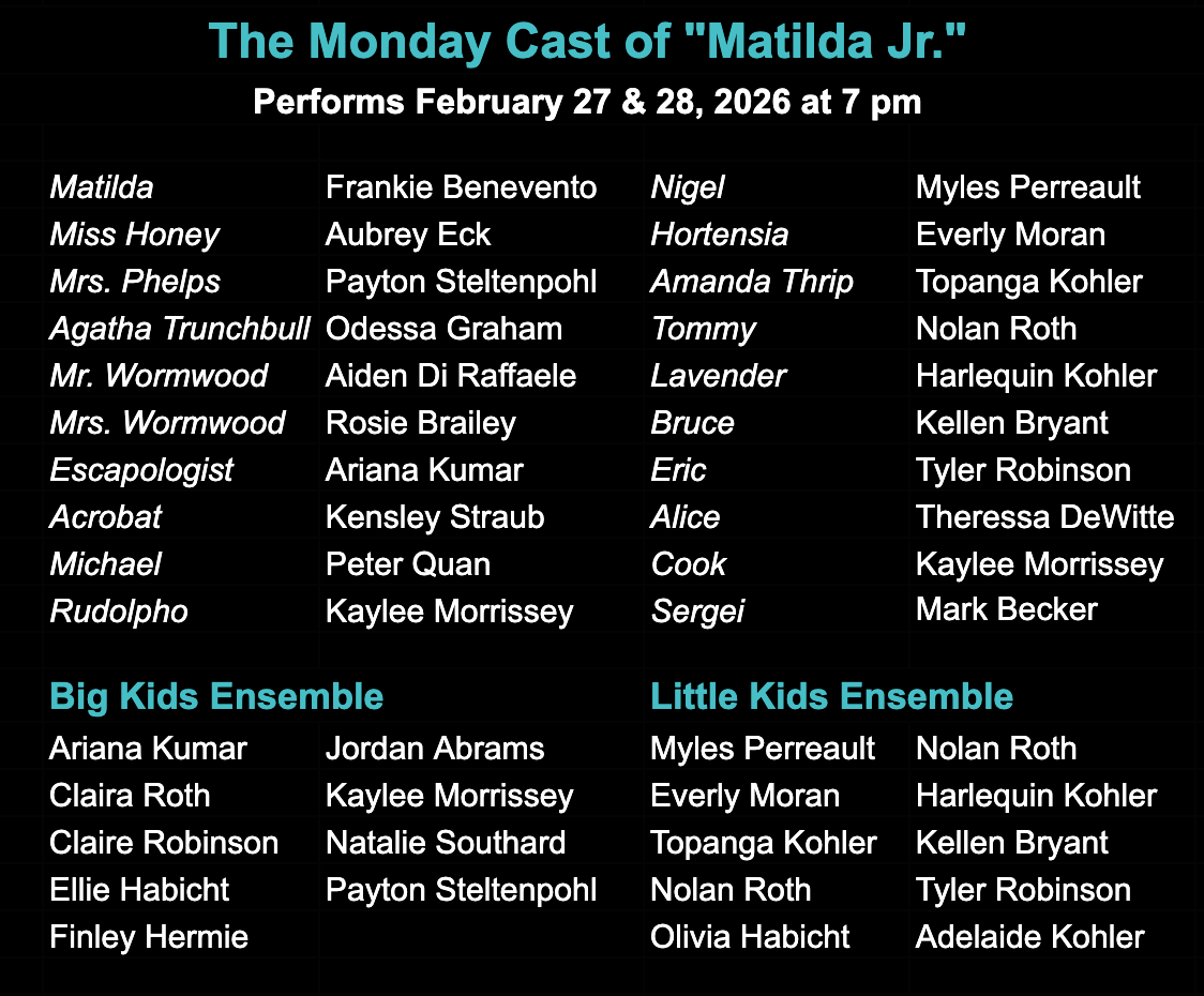 Harlequin Kohler, Myles Perrault, Melody Beckman, Abby Rachlin, Jack Albrecht, Lydia Hill, Summer Rehbein, Aliya Holzkopf, Anya Holzkopf, Emma Ferris, Remy Roberts, Matthew Schmidt, Gigi Michaels, Jack Deporter, Ethan Gazzo, Stella Buck, Stefan Shaeffer, & Claire Robinson, Bryce Andrews, Paige Underwood, Caitlin Taweponsomkiat, Whitney Carponelli, Frankie Benevento, Faith Andrews, Brydie Andrews, Jacob Aberle, Caleb Aberle, Harlow Carponelli, Mark Becker, Sinclair Galakatos, Lexi Laukaitis, Finley Hermie, Jordan Abrams, Violet Wilson, Ellie Habicht
